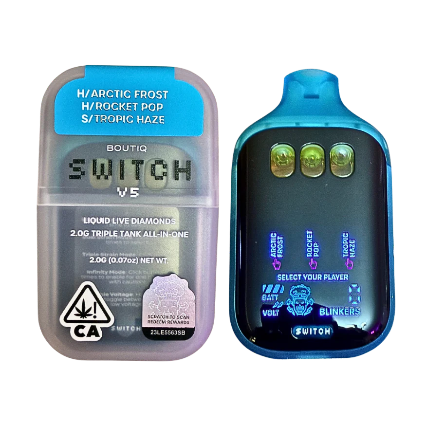 The Boutiq Switch V5 is a portable device designed to provide convenience, improved performance, and unique flavor options such as Arctic Frost x Rocket Pop x Tropic Haze.boutiq switch v5 review